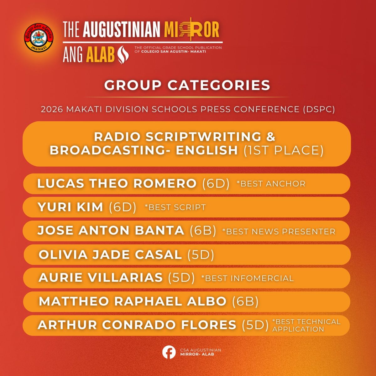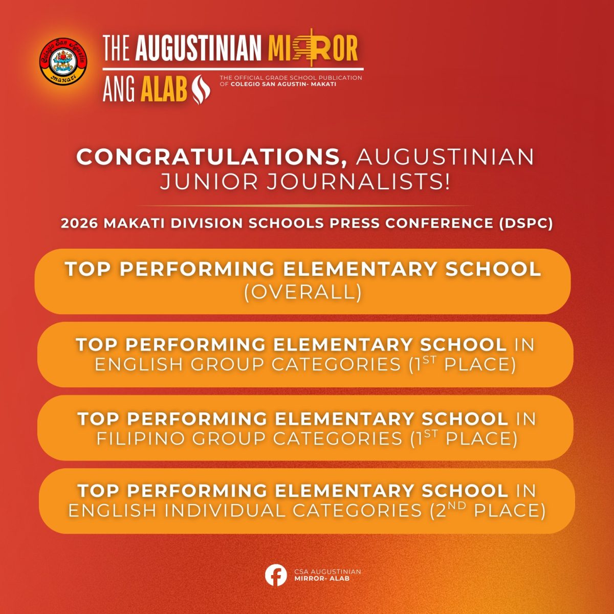 Congratulations to our Augustinian Junior Journalists of the Grade School Department’s Augustinian Mirror – Alab for their outstanding performance in the recently concluded Makati Division Schools Press Conference! 📰✨