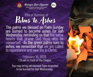 The burning of blessed palm leaves from last yearโs Palm Sunday will take place after the 6:45 a.m. Mass on February 16, 2026 (Monday). These palms are reverently burned to prepare the ashes that will be imposed on our foreheads as a sign of repentance, humility, and our commitment to renewal in Christ.