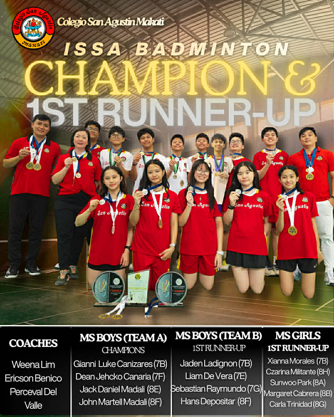 Champions All Around! Our Middle School Badminton Teams have been unstoppable! At the Inter Scholastic Sports Association (ISSA) Badminton Tournament last February 14, 2026 held at Brent International School, they delivered an incredible performance: • Champions: Middle School Boys Team A Gianni Luke Cañizares (7B), Dean Jecho Canaria (7F), Jack Daniel Madali (8E), and John Martell Madali (8F) • 1st Runner up: Middle School Boys Team B Jaden Ladignon (7B), Liam De Vera (7E), Hans Peter Depositar (8F), Sebastian Raymundo (7G), • Middle School Girls Team also brought home Silver Xianna Morales (7B), Park Sunwoo (8A), Margaret Cabrera (8B), Carla Trinidad (8G), Czarina Militante (8H)